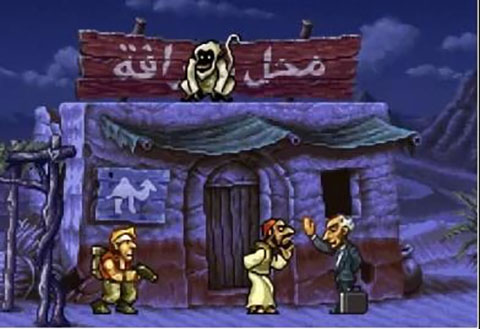 在《合金弹头2》中会有两个阿拉伯人在聊天,虽然没有声音,但是肢体动作还是挺丰富的,如果玩家开枪惊扰了阿拉伯人,他们会直接大叫着跑路。但在《合金弹头X》中换成了阿拉伯人在和游戏公司杜克·高堂进行聊天,指挥官可以直接从他们身边走过,顺走社长的公文包获得500分数加成。