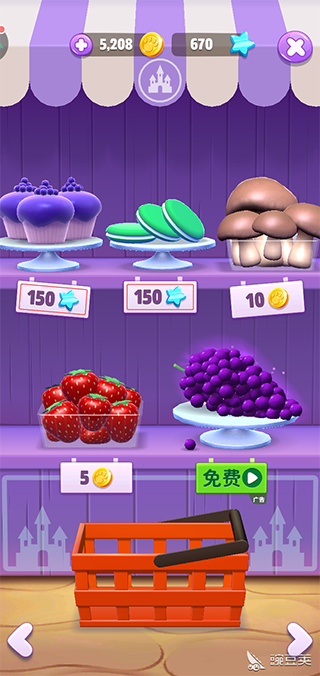 我们能在图中看到不同的食物有不同的购买方式。图中葡萄要用25个金币买。金币一般可以在飞行篮子或每日任务中可以获取一点,还有每天三次难度不同的 拼图 也可以获取到几百个。图中的蓝莓蛋糕要用星星值来购买。星星值只能在飞行篮子中获取。然后图中的草莓购买方式就很简单了,只要观看一个30秒的视频就可以获得一个草莓。