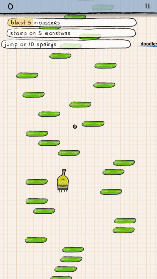 doodle jump的中文译名叫做涂鸦跳跃,这是一款非常经典的休闲闯关手游,采用Q版卡通涂鸦风格进行画面的呈现,整体十分轻量化,在大型游戏层出不穷的今天,看起来反而有一种“文艺复兴”的感觉。这款游戏的玩法对于玩家的反应能力、眼力以及手速都是极大的考验,虽然简单易上手,但是随着闯关的进度,难度将大幅提升。为了让玩家获得更好的游戏体验,doodle jump提供了丰富多样的道具,帮助轻松刷新最高分数记录。