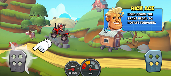 4、左下角的刹车键除了用于减速,还能在飞跃坡道时控制车身旋转姿态,帮助玩家在空中稳住重心;