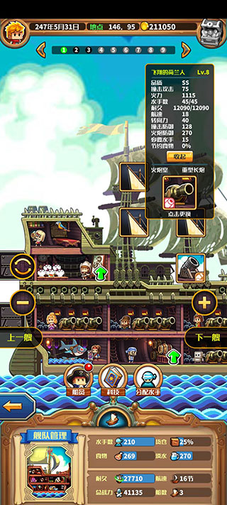 2、火炮室拉满,引擎室拉满,水手室3-4级(注意,这个版本升级船不加必要水手数,但升级水手室会涨)(肉搏船拉满),厨房看心情,船长室能升就升,仓库……总感觉7升8不值得,但这和外传不太一样……