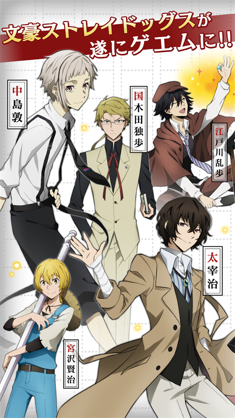 怀有文豪之名的游戏角色集结,无论是号称横滨F4的中岛敦、太宰治、芥川龙之介、中原中也,还是两大组织的头目福泽谕吉、森鸥外,还有泉镜花、江户川乱步、织田作之助、坂口安吾、费奥多尔等各种人气角色,你都有可能召集他们,成为队伍中的一员。