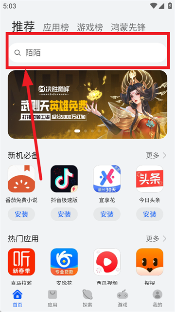 下载安装并打开华为应用商店,在主页搜索框直接搜索需要下载的应用或游戏