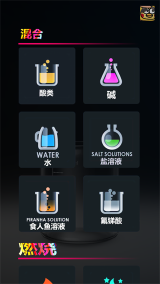 在弹出的菜单中选择要进行的化学实验,如混合反应或燃烧反应(例如酸碱中和反应、金属燃烧反应等)。