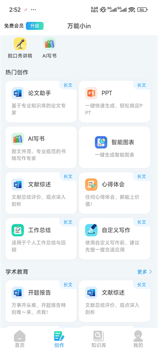 3、或者点击创作板块这里内置各种模版【AI写作、PPT、智能图表、工作总结等等】可直接生成完整的稿子,点击即可使用【需要升级会员才能使用】