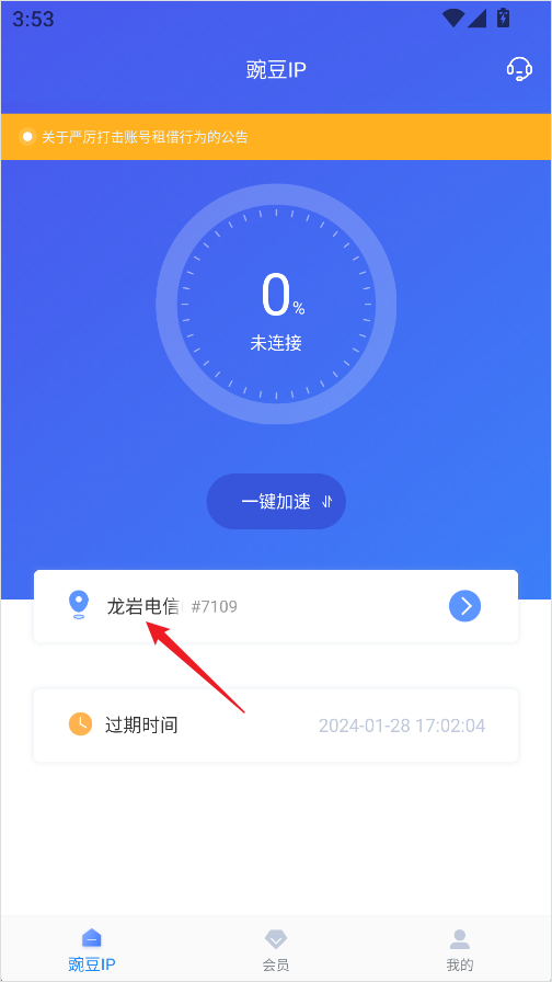 1、如果你觉得当前使用的IP不理想,想要更换一个新的IP,可以先打开APP,在首页点击【线路选择】。