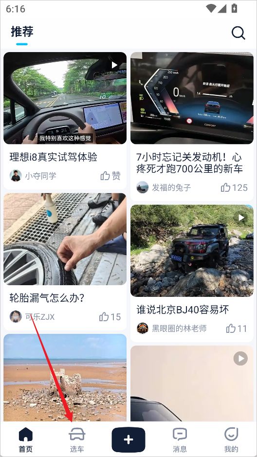 1、打开软件后,点击底部导航栏中的【选车】功能;