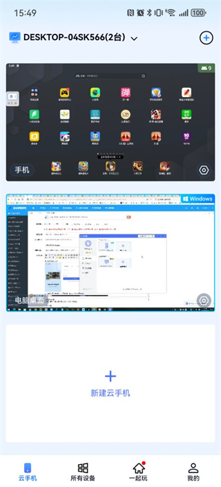 注意:一般最后一个是电脑桌面(表示可以控制电脑的),前面的都是云手机(模拟器)。另外,如果要手机控制模拟器那么就点前面几个小画面进去就可以啦!