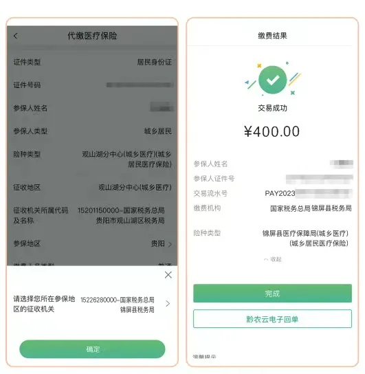 步骤四:选择参保地区征收机关后,点击“确定”,缴费成功。