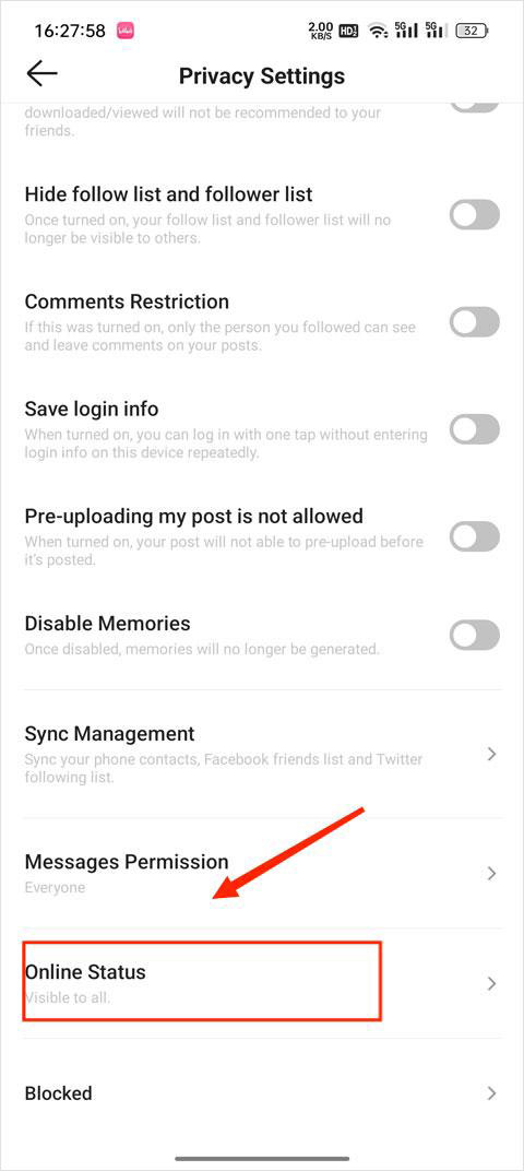 4、将页面滑动到底部,找到【Online Status】在线状态;